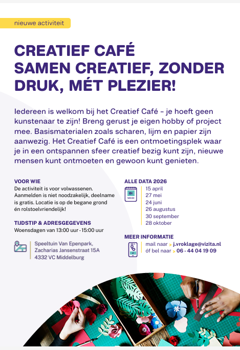 1x per maand verzorgt Vizita het Creatief Café in Van Epenpark. Tijdens deze gezellige middag staat ontmoeting centraal. Iedereen is welkom om aan te schuiven, creatief bezig te zijn en andere mensen te ontmoeten in een ontspannen sfeer.
